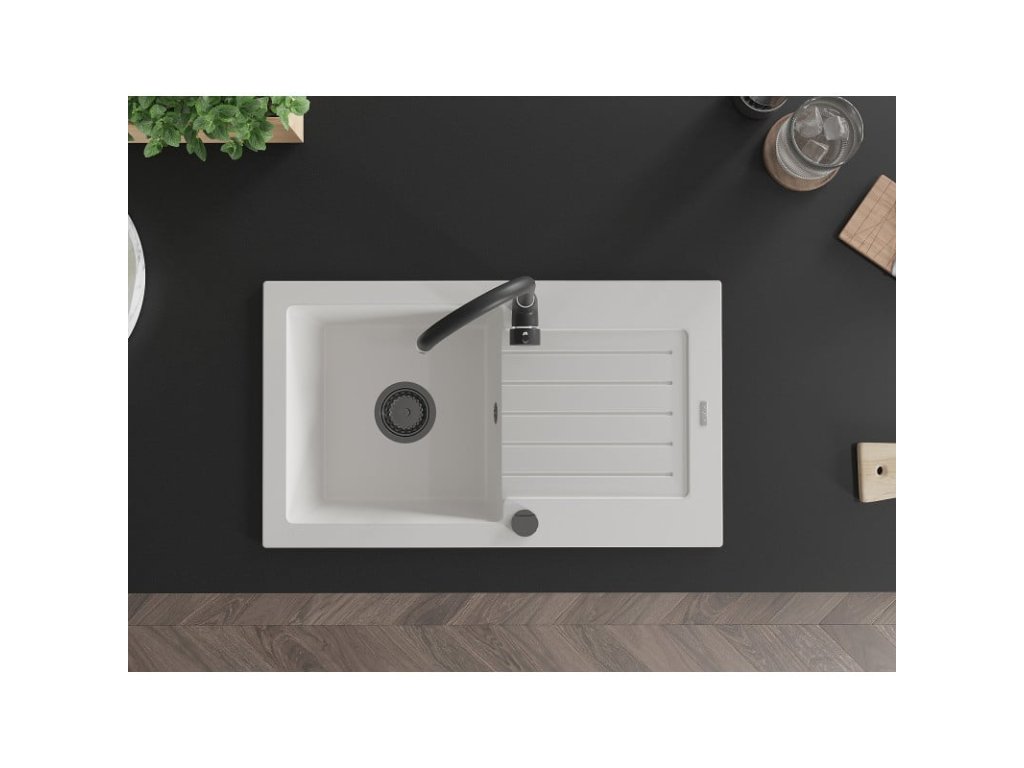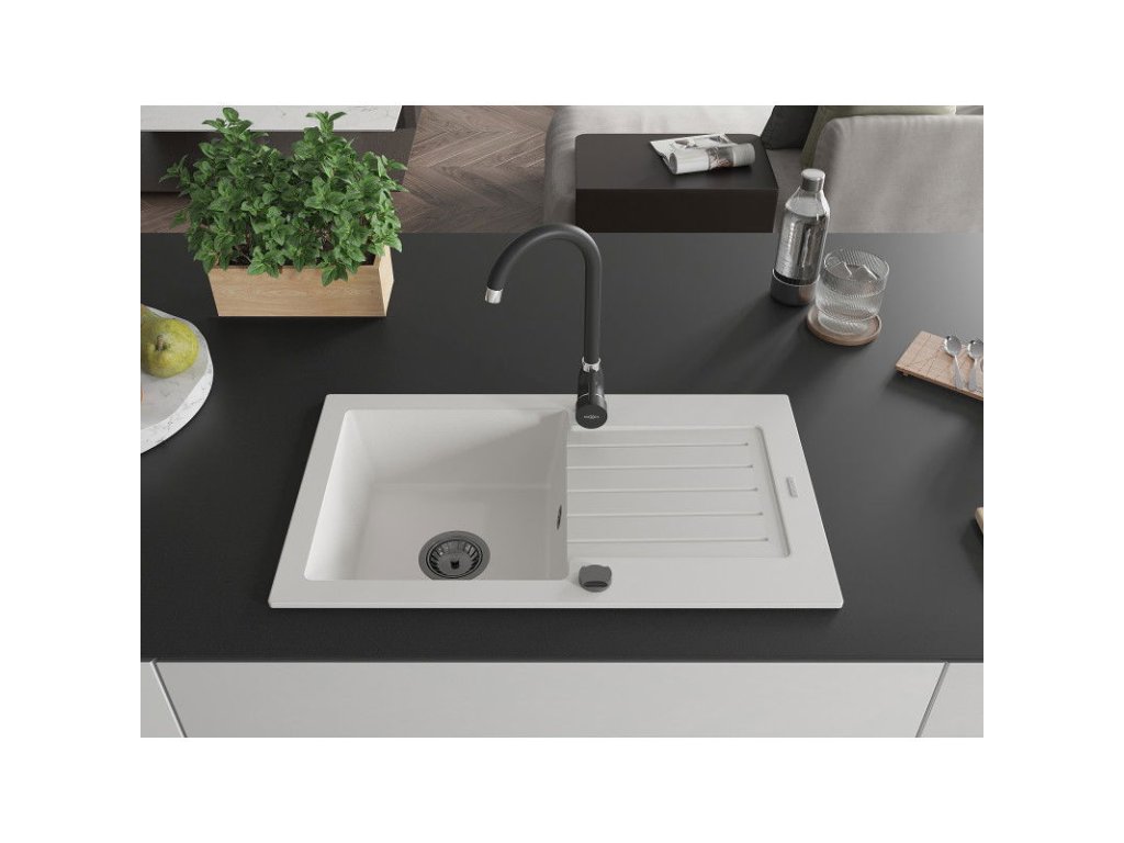 Granitový drez Mexen Pablo s 1 misou, odkapávačom a kuchynskou batériou Telma, biely - 6510-20-670200-70