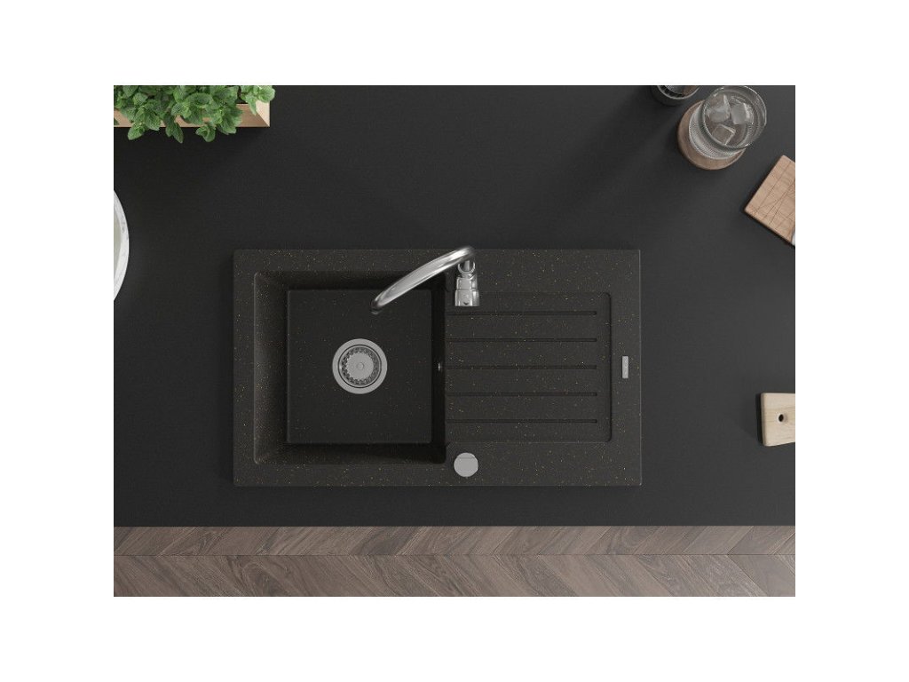 Granitový drez Mexen Pablo s 1 misou, odkapávačom a kuchynskou batériou Telma, čierna/zlatá - 6510-75-670200-00