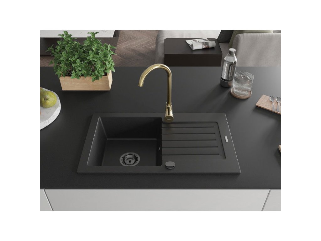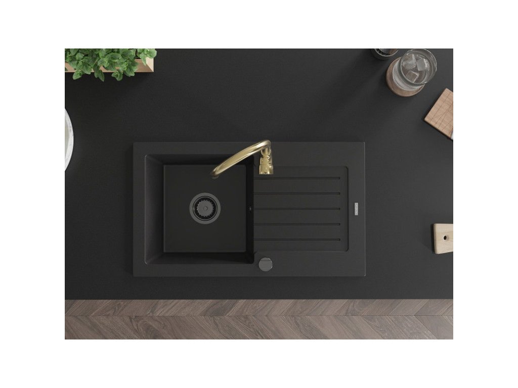 Granitový drez Mexen Pablo s 1 misou, odkapávačom a kuchynskou batériou Telma, čierny - 6510-77-670200-50-B