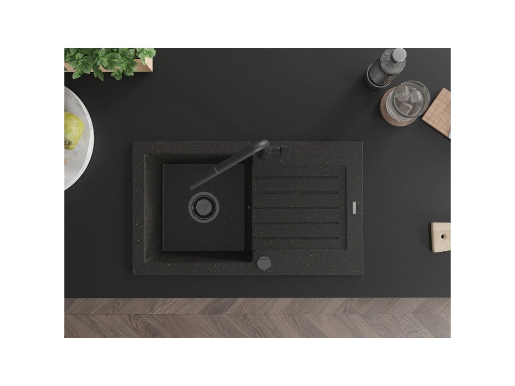 Granitový drez Mexen Pablo s 1 misou, odkvapkávačom a batériou Flora, čierna/zlatá metalíza - 6510-75-670401-70-B