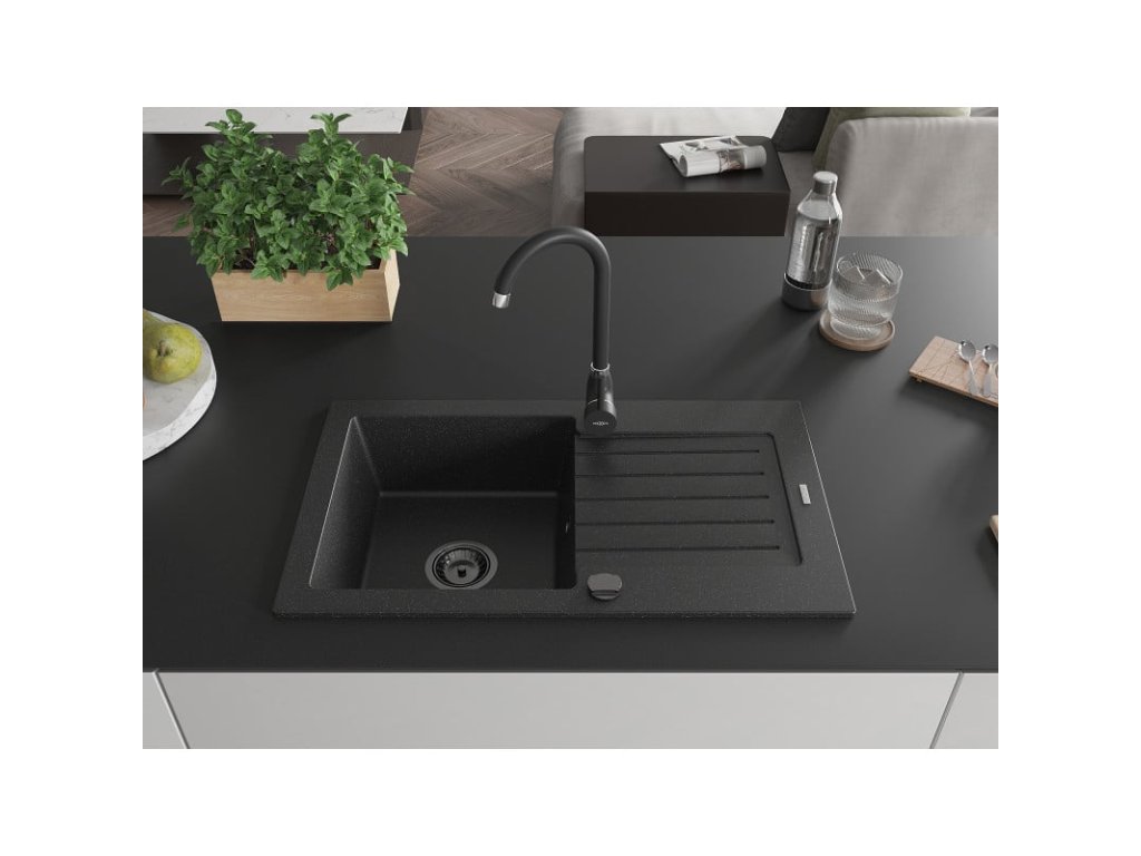 Granitový drez Mexen Pablo s 1 misou a odkapávačom 752 x 436 mm, čierna/strieborná metalíza, čierny sifón - 6510751010-73-B