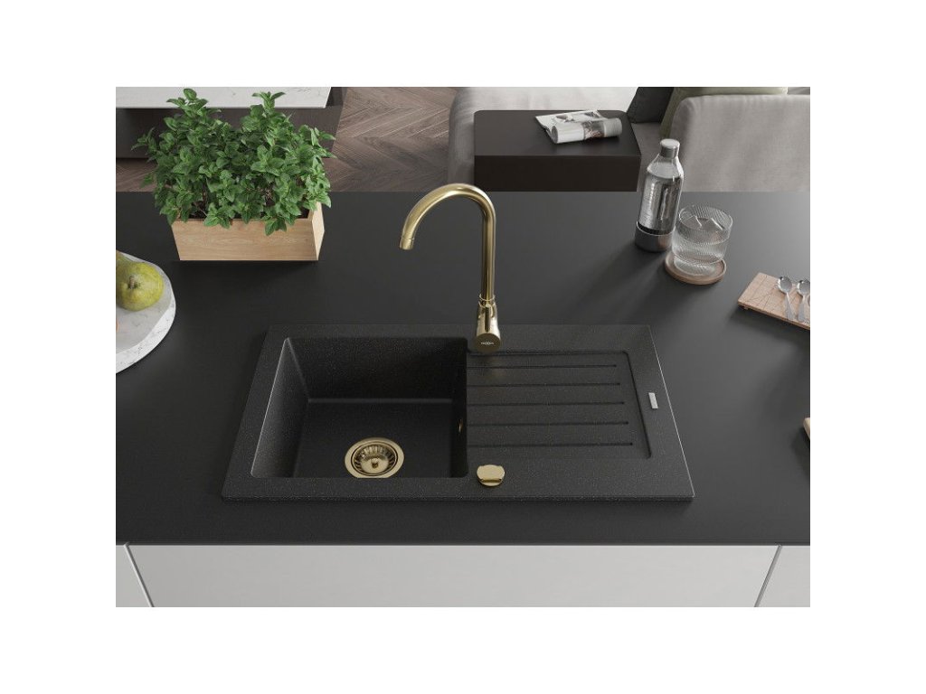 Granitový drez Mexen Pablo s 1 misou a odkapávačom 752 x 436 mm, čierna/strieborná metalíza, zlatý sifón - 6510751010-73-G