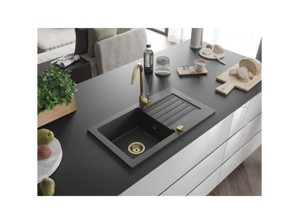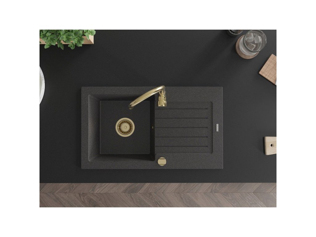 Granitový drez Mexen Pablo s 1 misou a odkapávačom 752 x 436 mm, čierny bodkovaný, zlatý sifón - 6510751010-76-G