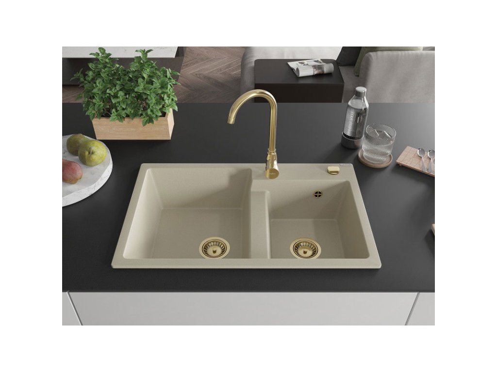 Granitový drez Mexen Tomas s 2 misami 800 x 500 mm, béžový, zlatý sifón - 6516802000-69-G
