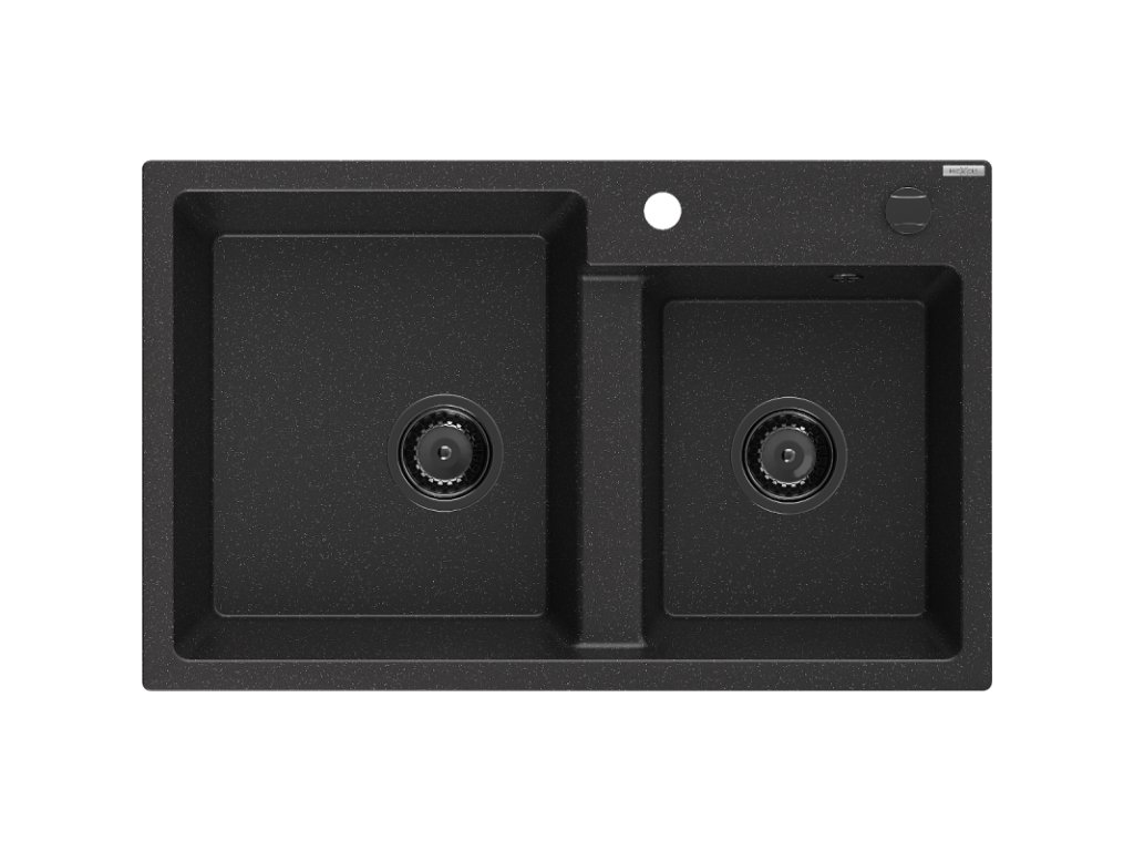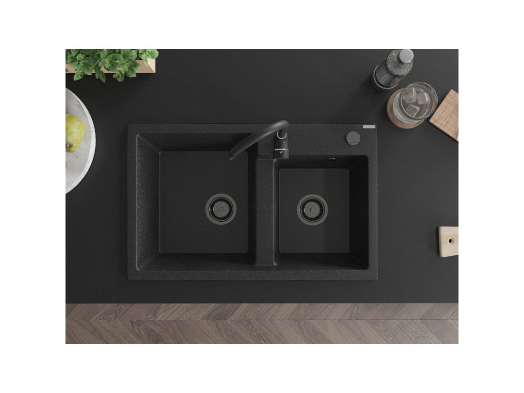 Granitový drez Mexen Tomas s 2 misami 800 x 500 mm, čierna/strieborná metalíza, čierny sifón - 6516802000-73-B
