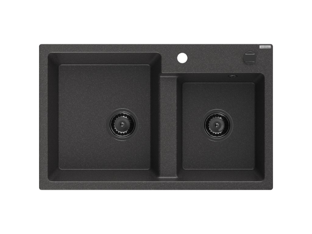 Granitový drez Mexen Tomas s 2 misami 800 x 500 mm, čierny bodkovaný, čierny sifón - 6516802000-76-B