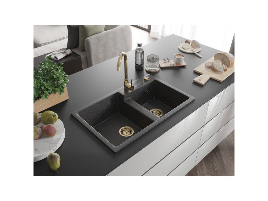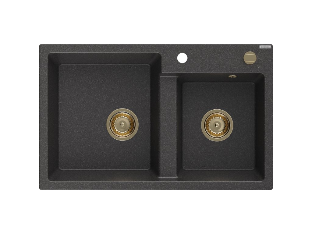 Granitový drez Mexen Tomas s 2 misami 800 x 500 mm, čierny bodkovaný, zlatý sifón - 6516802000-76-G