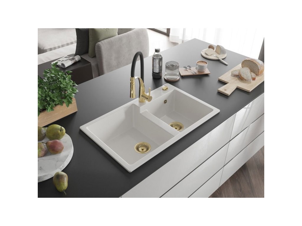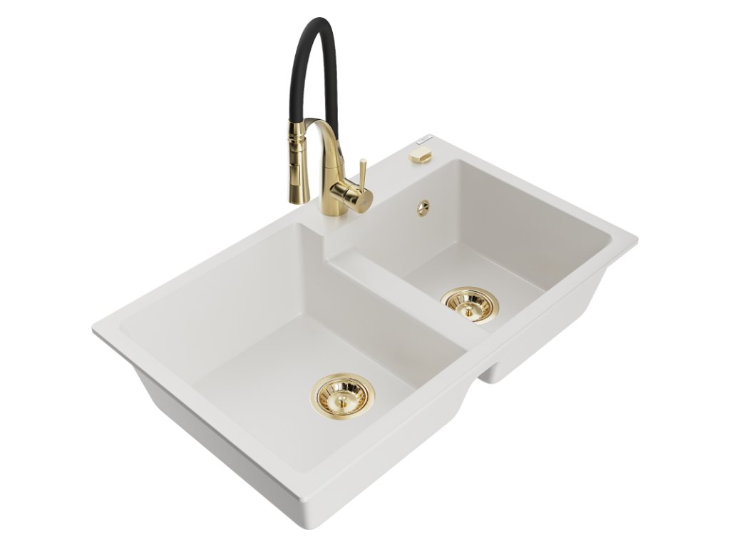 Granitový drez Mexen Tomas s 2 misami a kuchynskou batériou Aster, biely - 6516-20-73450-57-G