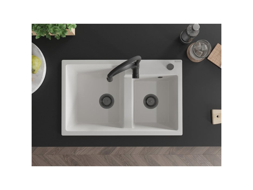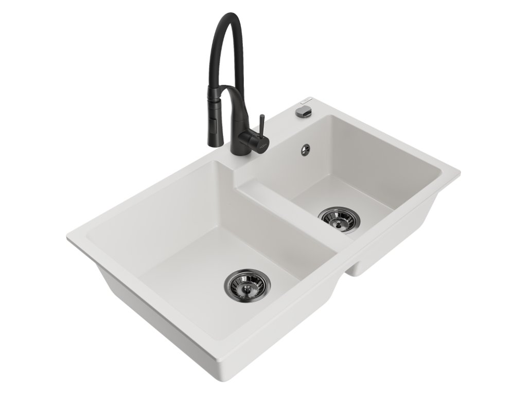 Granitový drez Mexen Tomas s 2 misami a kuchynskou batériou Aster, biely - 6516-20-73450-70-B