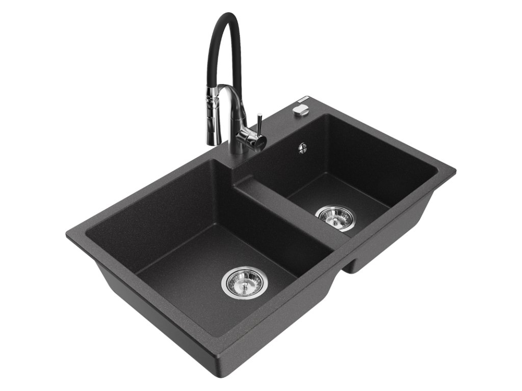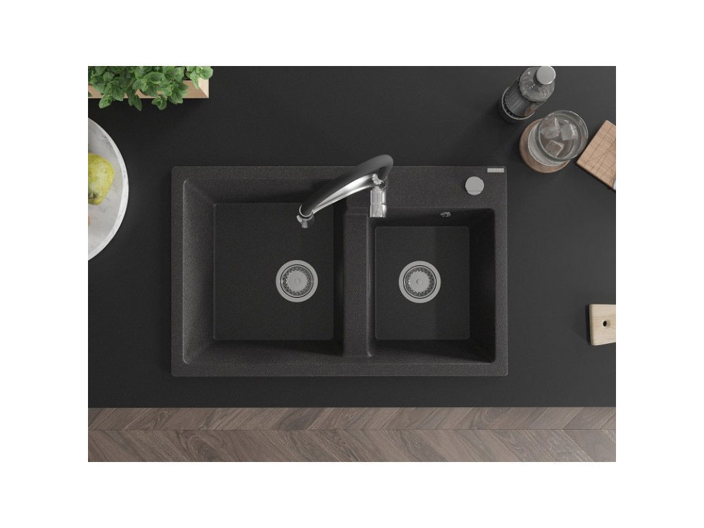 Granitový drez Mexen Tomas s 2 misami a kuchynskou batériou Aster, čierna škvrnitá - 6516-76-73450-07