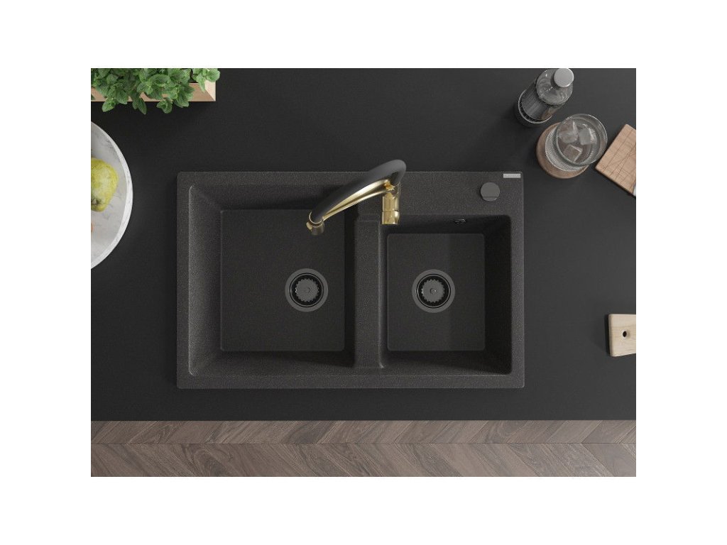 Granitový drez Mexen Tomas s 2 misami a kuchynskou batériou Aster, čierna škvrnitá - 6516-76-73450-57-B