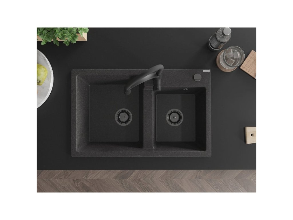 Granitový drez Mexen Tomas s 2 misami a kuchynskou batériou Aster, čierna škvrnitá - 6516-76-73450-70-B