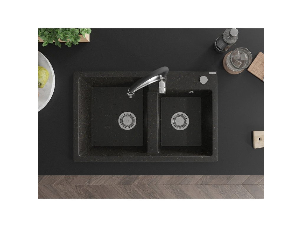Granitový drez Mexen Tomas s 2 misami a kuchynskou batériou Aster, čierna/zlatá metalíza - 6516-75-73450-07