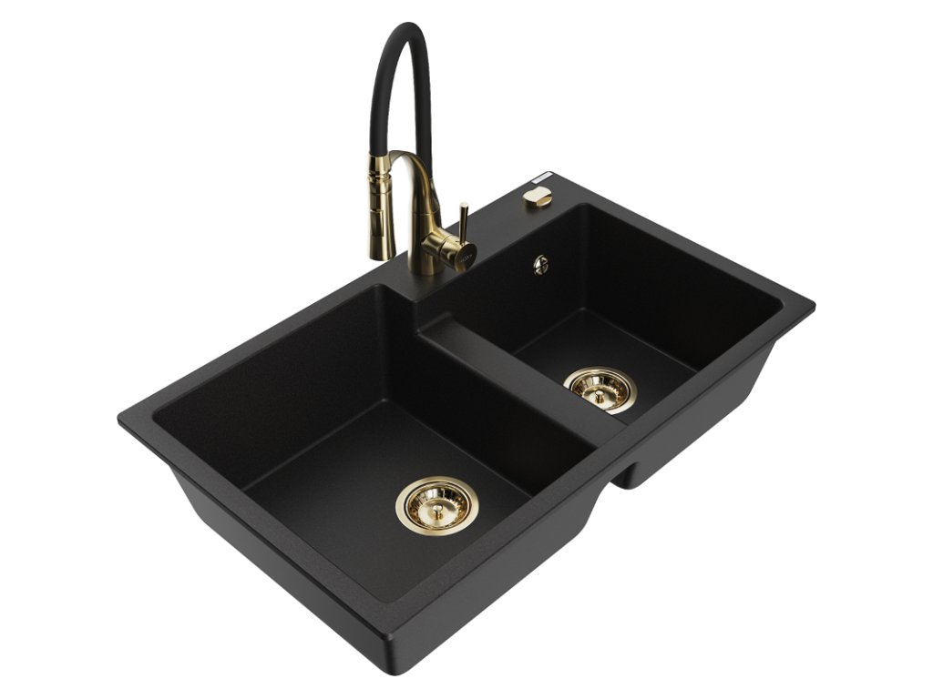Granitový drez Mexen Tomas s 2 misami a kuchynskou batériou Aster, čierny - 6516-77-73450-57-G