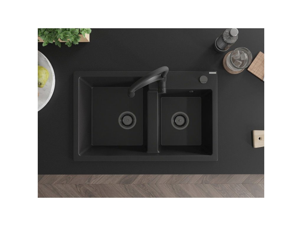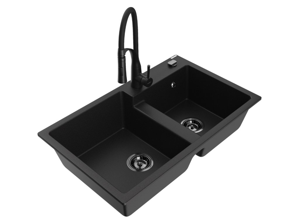 Granitový drez Mexen Tomas s 2 misami a kuchynskou batériou Aster, čierny - 6516-77-73450-70-B