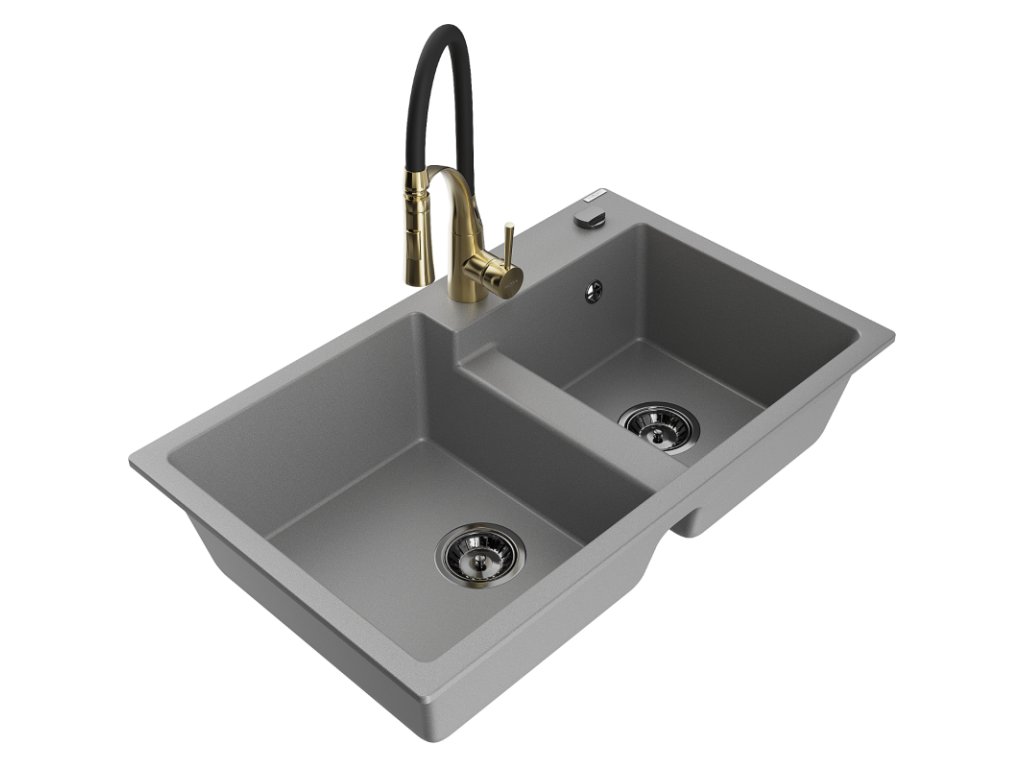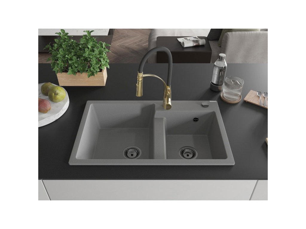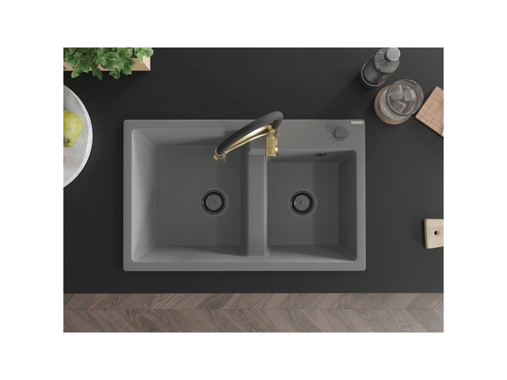Granitový drez Mexen Tomas s 2 misami a kuchynskou batériou Aster, sivý - 6516-71-73450-57-B