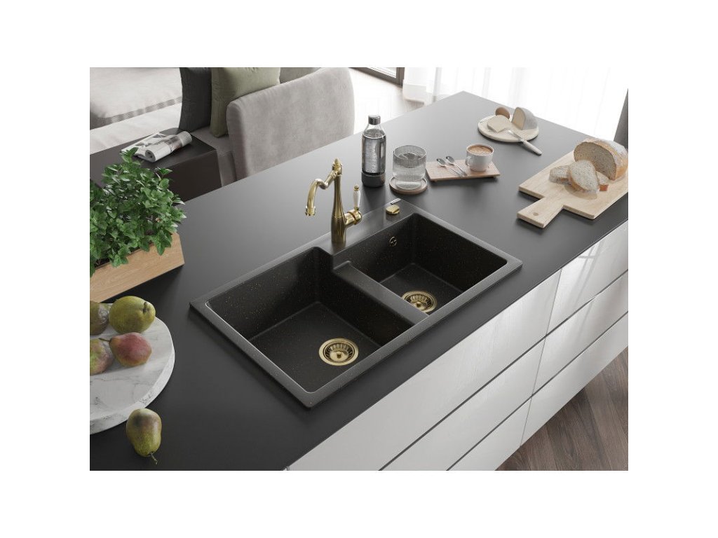 Granitový drez Mexen Tomas s 2 misami a kuchynskou batériou Carla, čierna/zlatá metalíza - 6516-75-670700-50