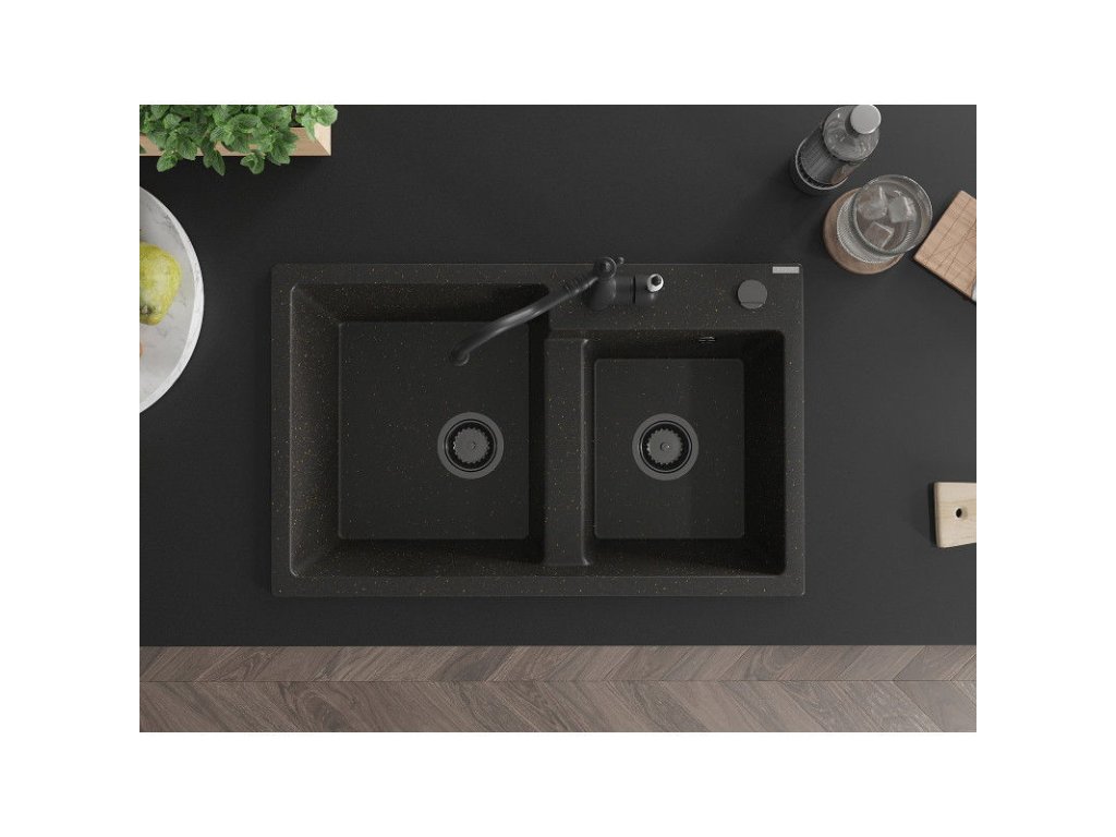 Granitový drez Mexen Tomas s 2 misami a kuchynskou batériou Carla, čierna/zlatá metalíza - 6516-75-670700-70-B