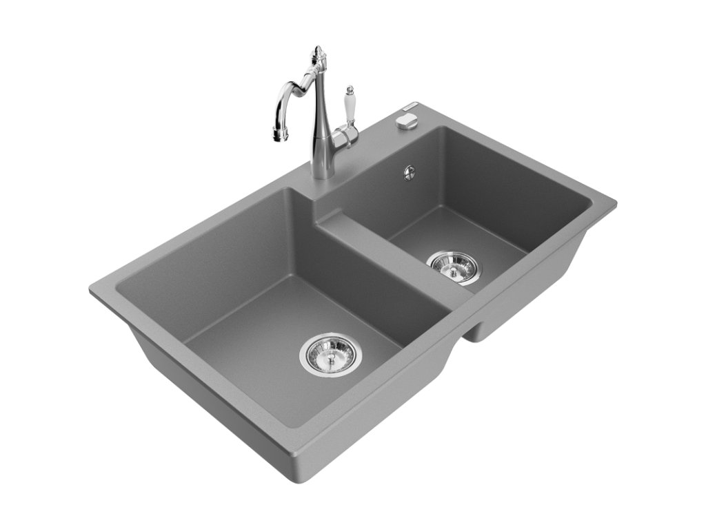Granitový drez Mexen Tomas s 2 misami a kuchynskou batériou Carla, sivý - 6516-71-670700-00