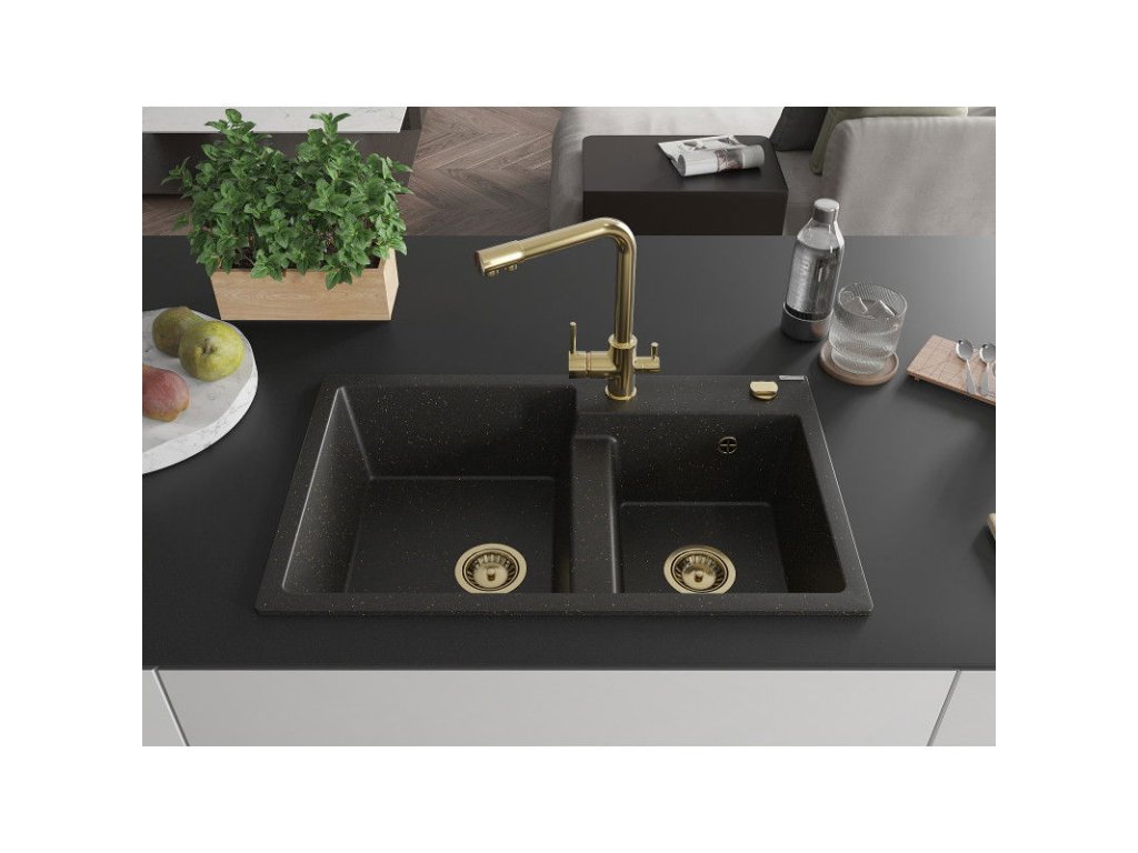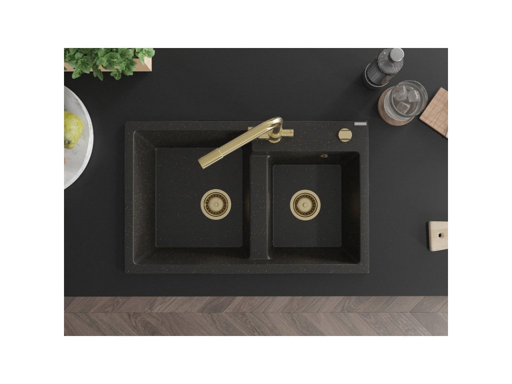 Granitový drez Mexen Tomas s 2 misami a kuchynskou batériou Duero, čierna/zlatá metalíza - 6516-75-671600-50
