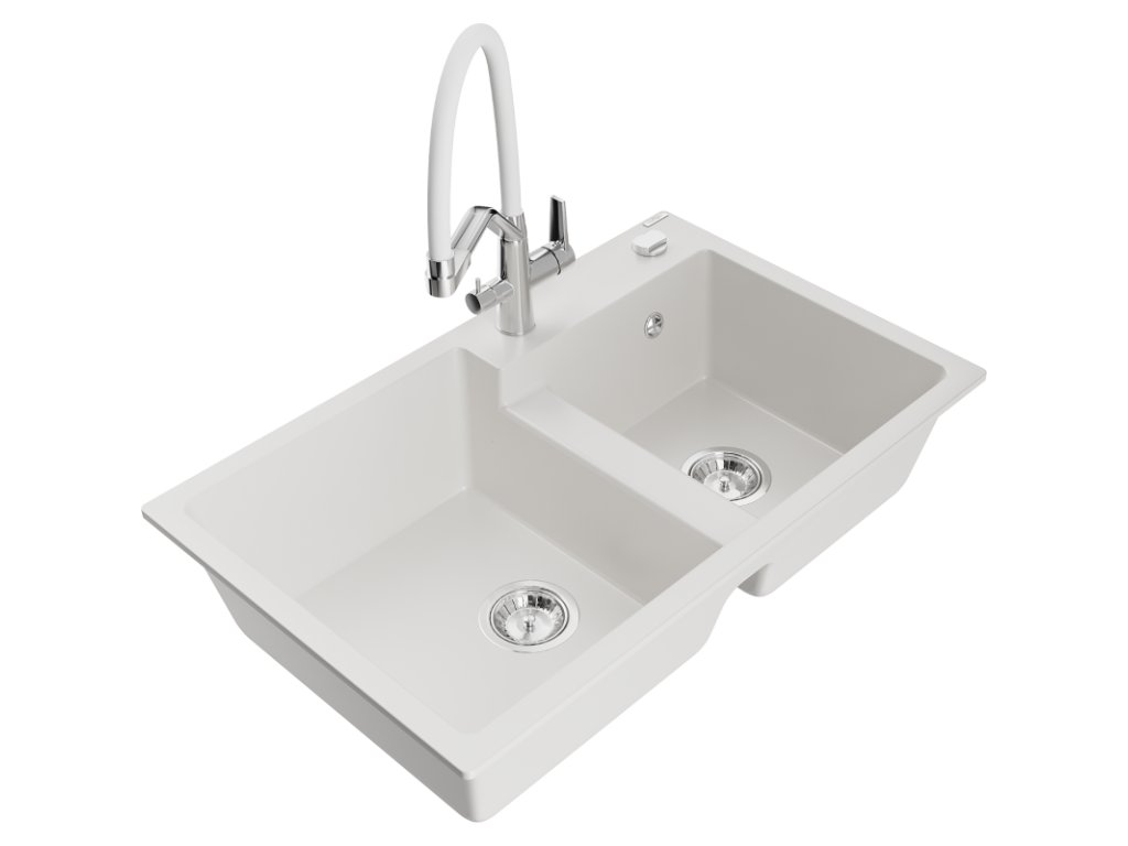 Granitový drez Mexen Tomas s 2 misami a kuchynskou batériou Duo, biely - 6516-20-671701-02