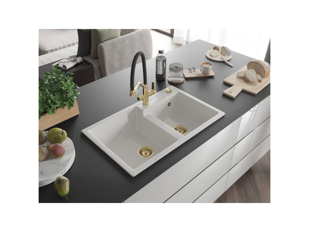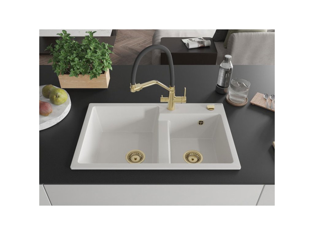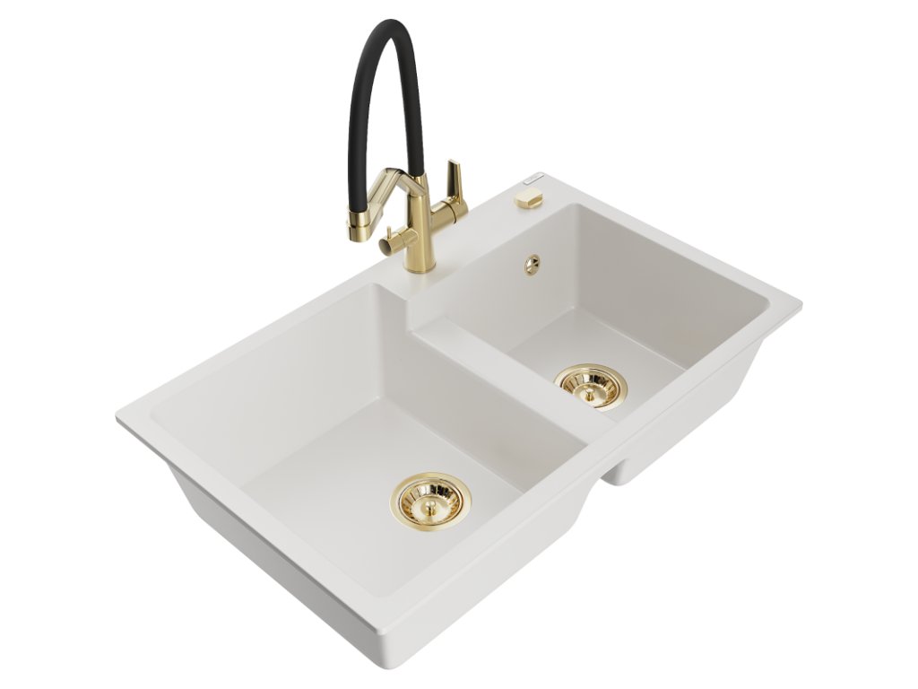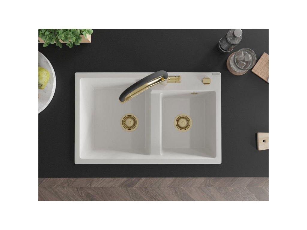Granitový drez Mexen Tomas s 2 misami a kuchynskou batériou Duo, biely - 6516-20-671701-57-G