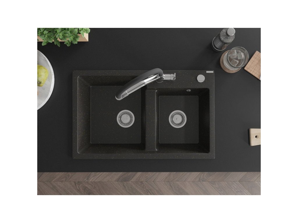 Granitový drez Mexen Tomas s 2 misami a kuchynskou batériou Duo, čierna/zlatá metalíza - 6516-75-671701-07