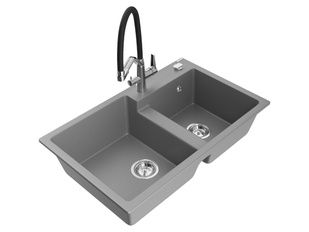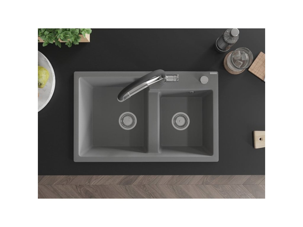 Granitový drez Mexen Tomas s 2 misami a kuchynskou batériou Duo, sivý - 6516-71-671701-07