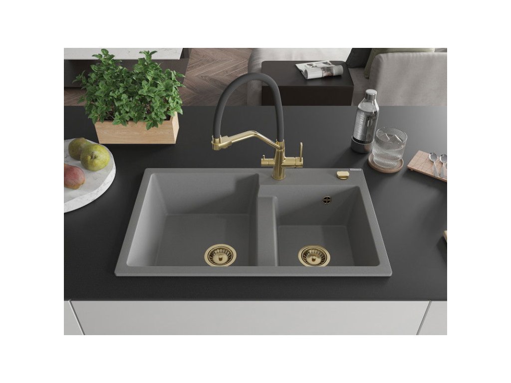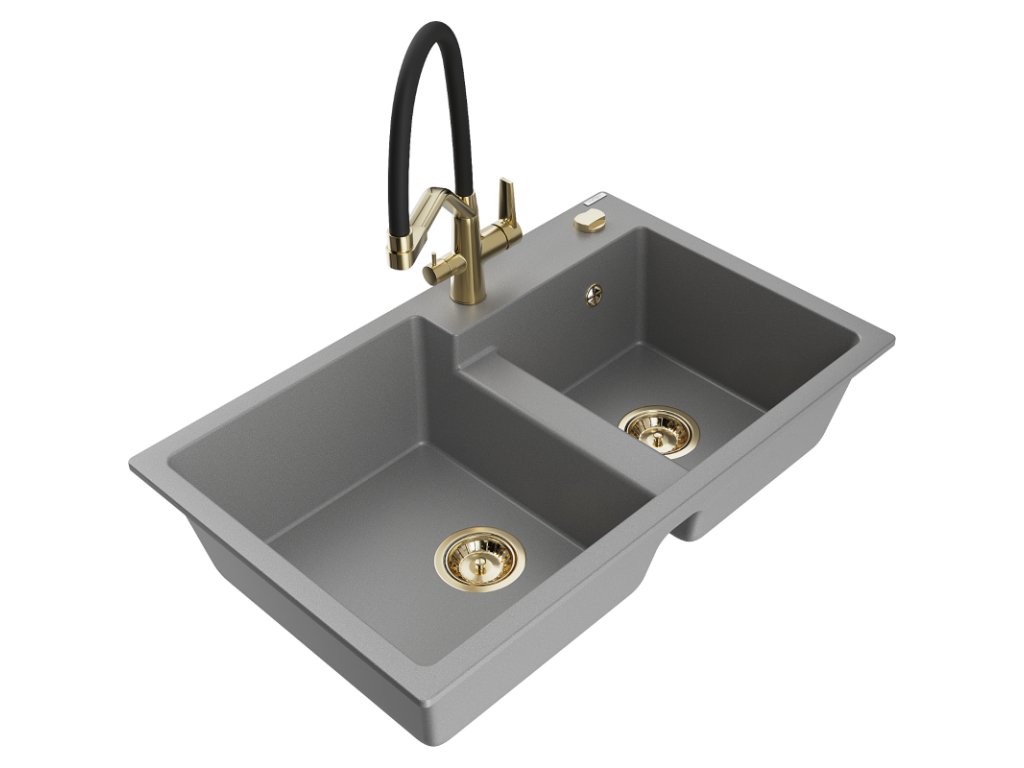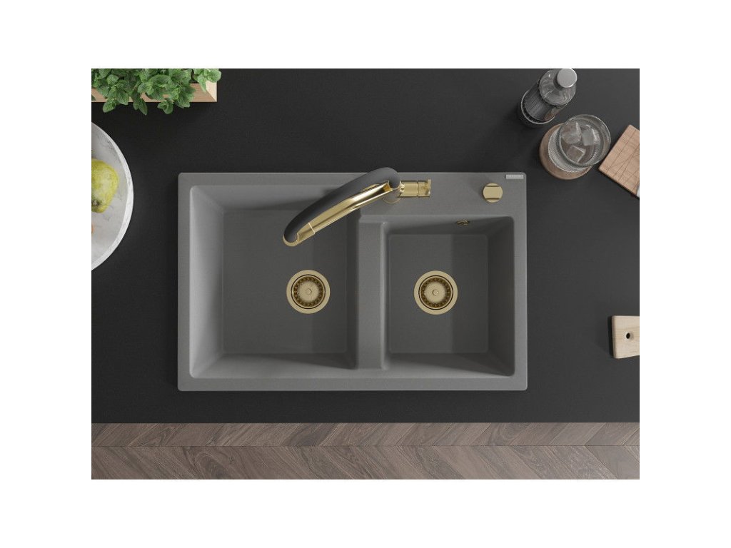 Granitový drez Mexen Tomas s 2 misami a kuchynskou batériou Duo, sivý - 6516-71-671701-57-G