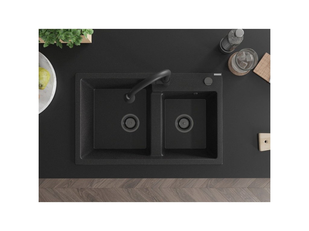 Granitový drez Mexen Tomas s 2 misami a kuchynskou batériou Elia, čierna/strieborná metalíza - 6516-73-670101-70-B