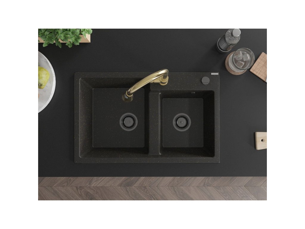 Granitový drez Mexen Tomas s 2 misami a kuchynskou batériou Elia, čierna/zlatá metalíza - 6516-75-670101-50-B
