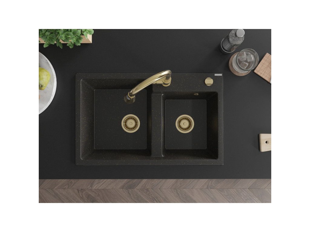 Granitový drez Mexen Tomas s 2 misami a kuchynskou batériou Elia, čierna/zlatá metalíza - 6516-75-670101-50