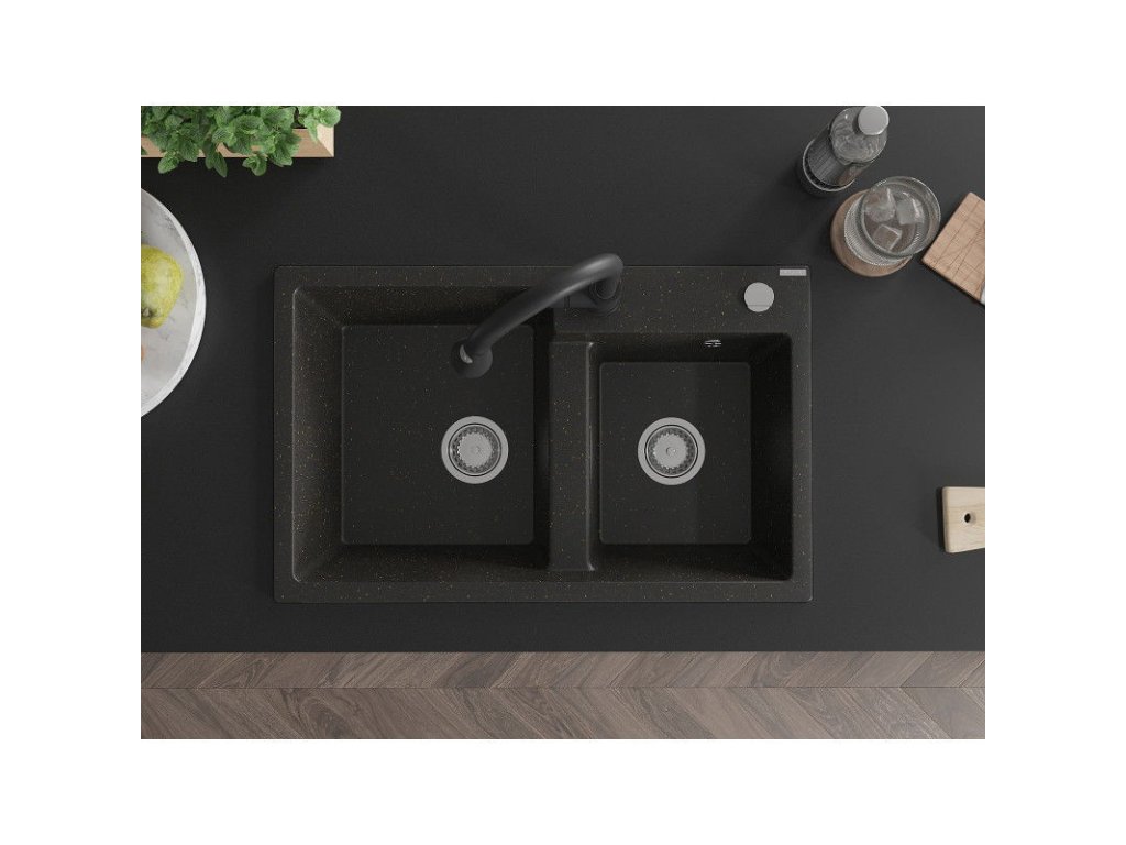 Granitový drez Mexen Tomas s 2 misami a kuchynskou batériou Elia, čierna/zlatá metalíza - 6516-75-670101-70