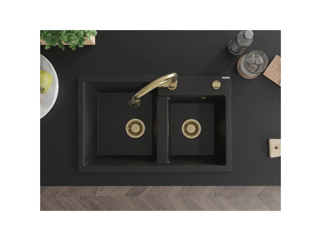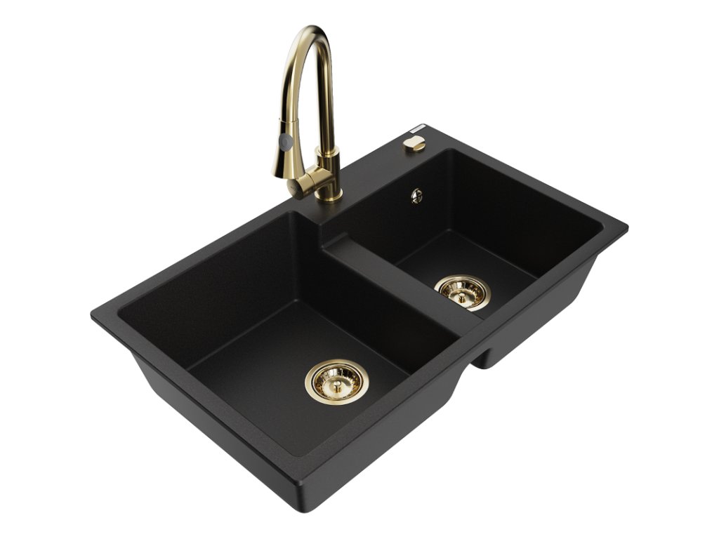 Granitový drez Mexen Tomas s 2 misami a kuchynskou batériou Elia, čierny - 6516-77-670101-50