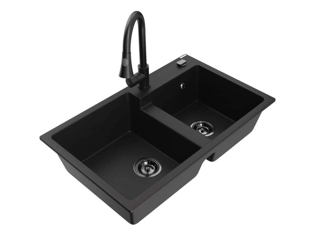 Granitový drez Mexen Tomas s 2 misami a kuchynskou batériou Elia, čierny - 6516-77-670101-70-B