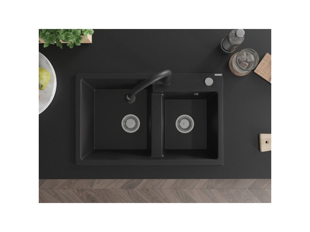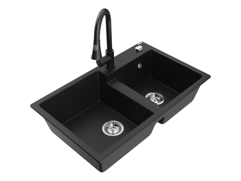 Granitový drez Mexen Tomas s 2 misami a kuchynskou batériou Elia, čierny - 6516-77-670101-70