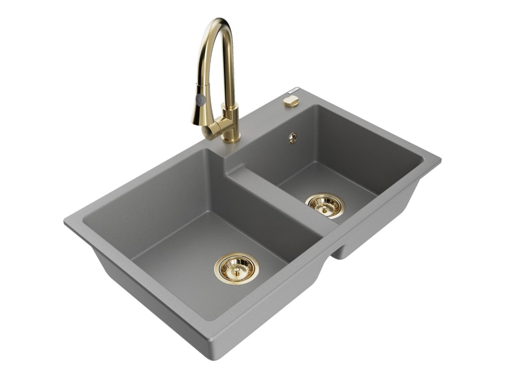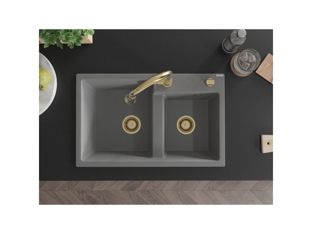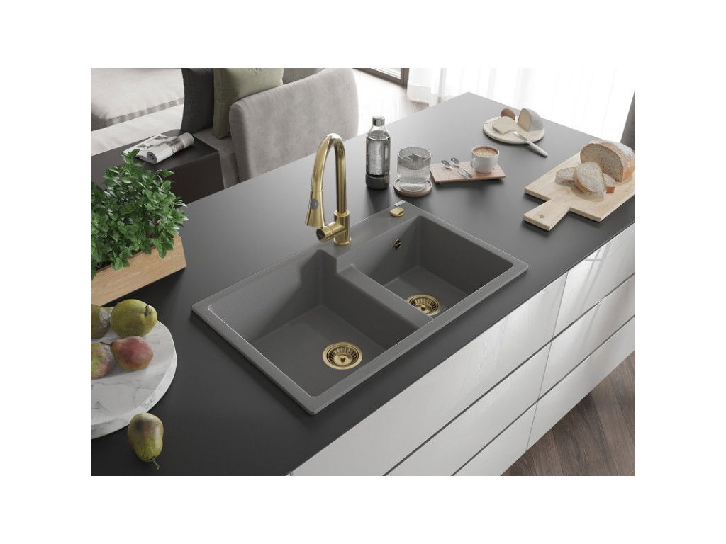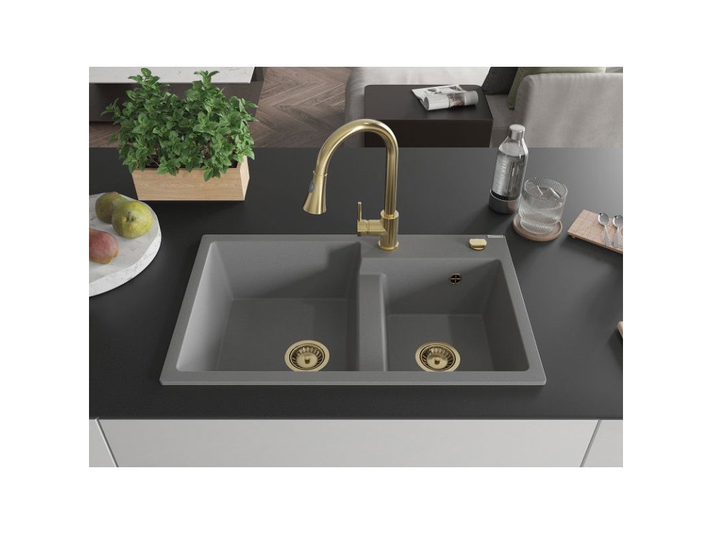 Granitový drez Mexen Tomas s 2 misami a kuchynskou batériou Elia, sivý - 6516-71-670101-50