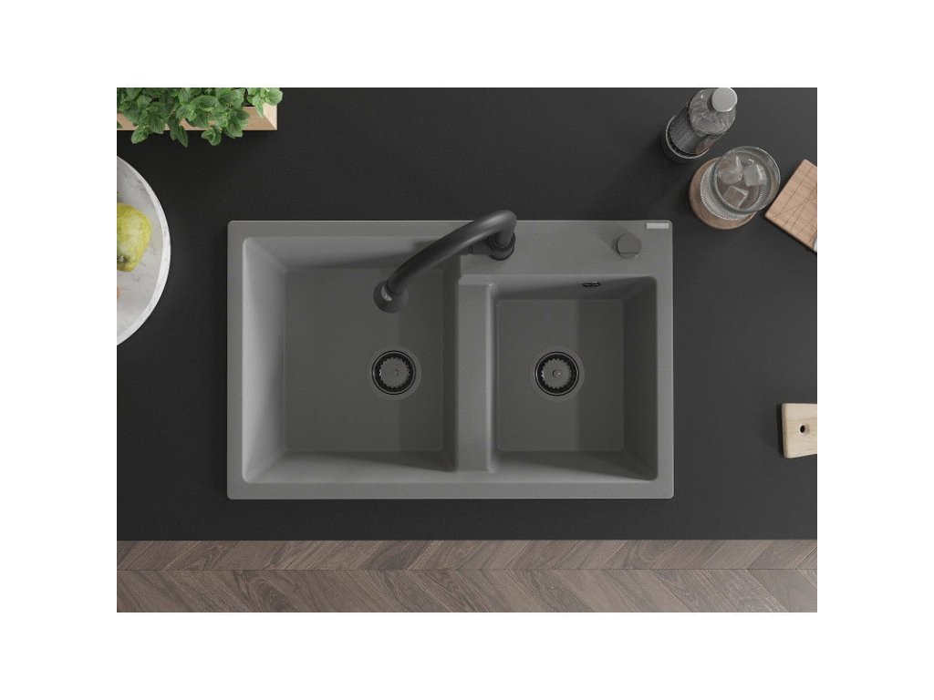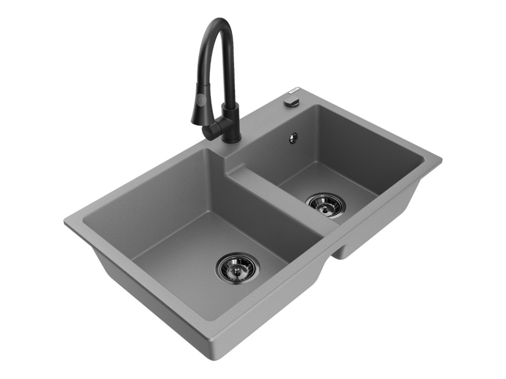 Granitový drez Mexen Tomas s 2 misami a kuchynskou batériou Elia, sivý - 6516-71-670101-70-B