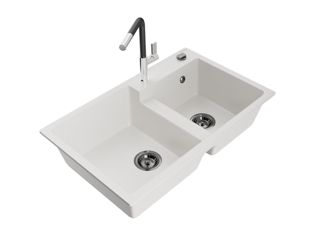Granitový drez Mexen Tomas s 2 misami a kuchynskou batériou Flora, biely - 6516-20-670401-07-B