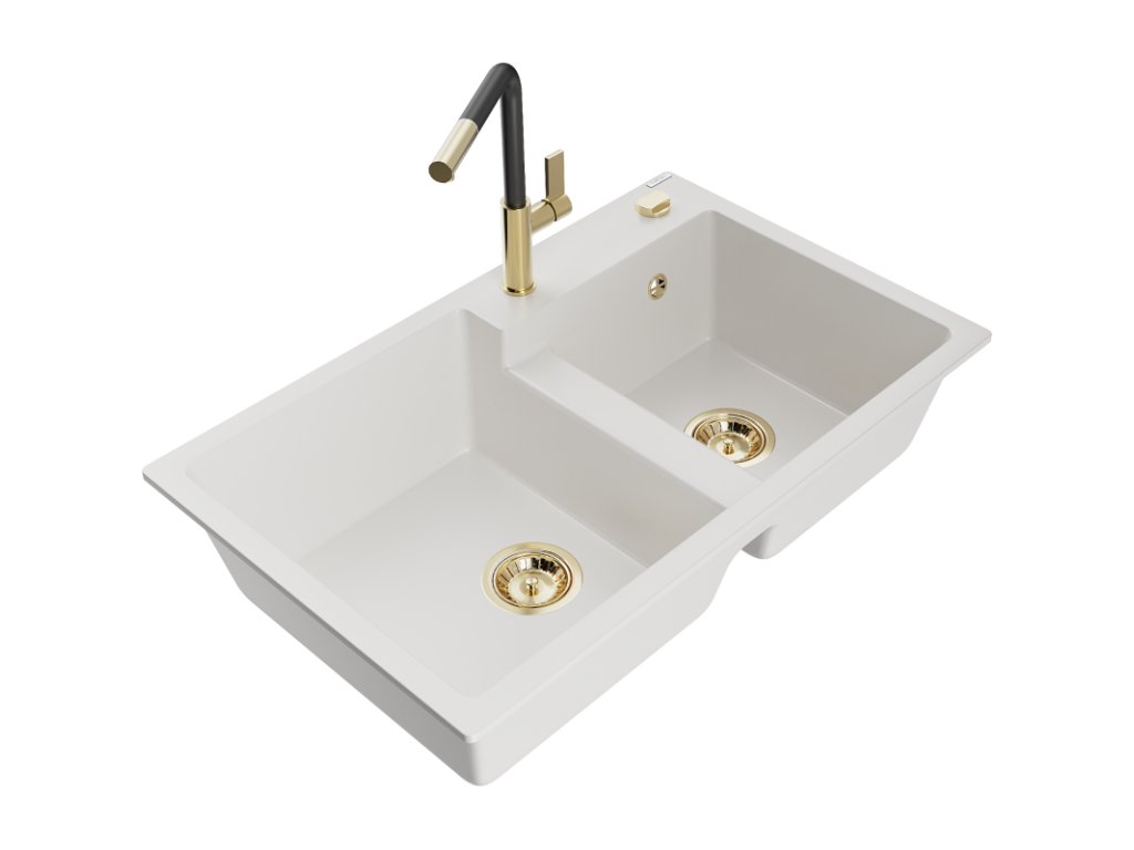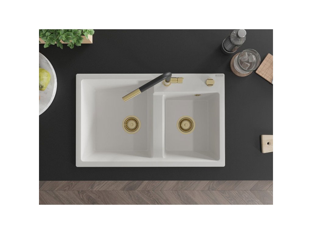 Granitový drez Mexen Tomas s 2 misami a kuchynskou batériou Flora, biely - 6516-20-670401-57-G