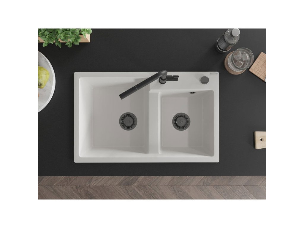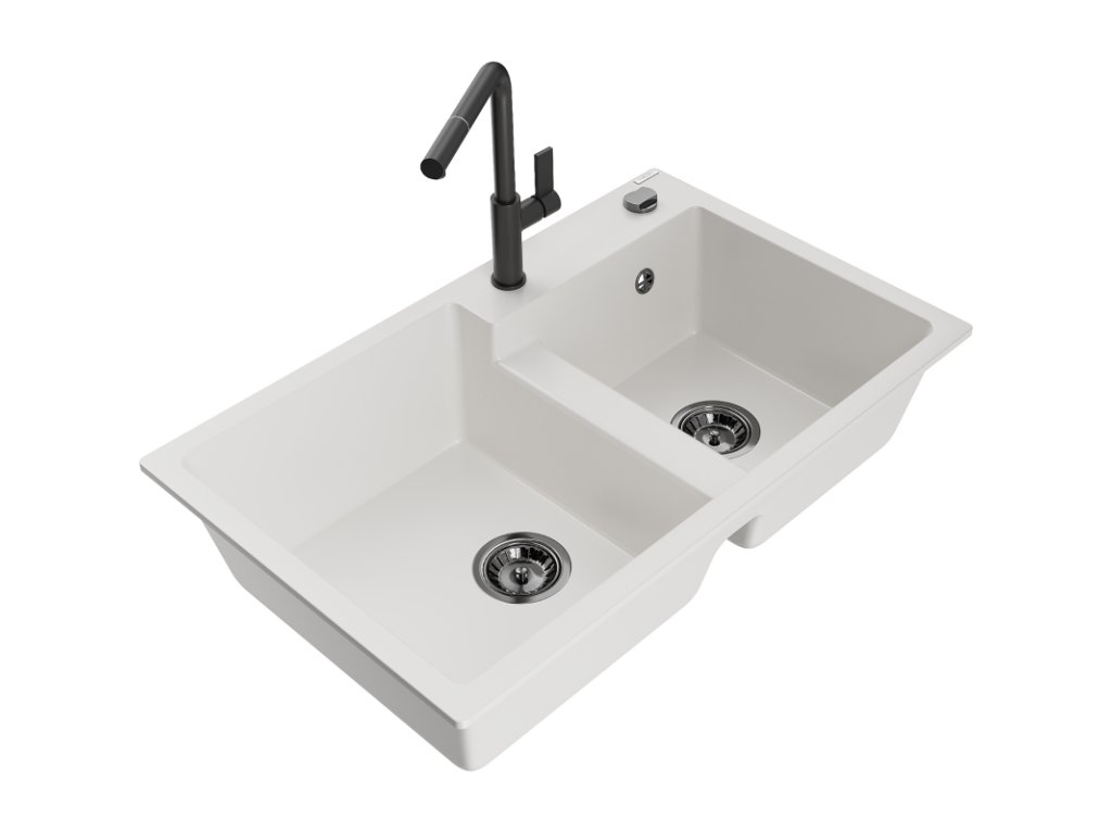 Granitový drez Mexen Tomas s 2 misami a kuchynskou batériou Flora, biely - 6516-20-670401-70-B