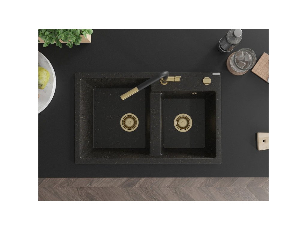 Granitový drez Mexen Tomas s 2 misami a kuchynskou batériou Flora, čierna/zlatá metalíza - 6516-75-670401-57-G