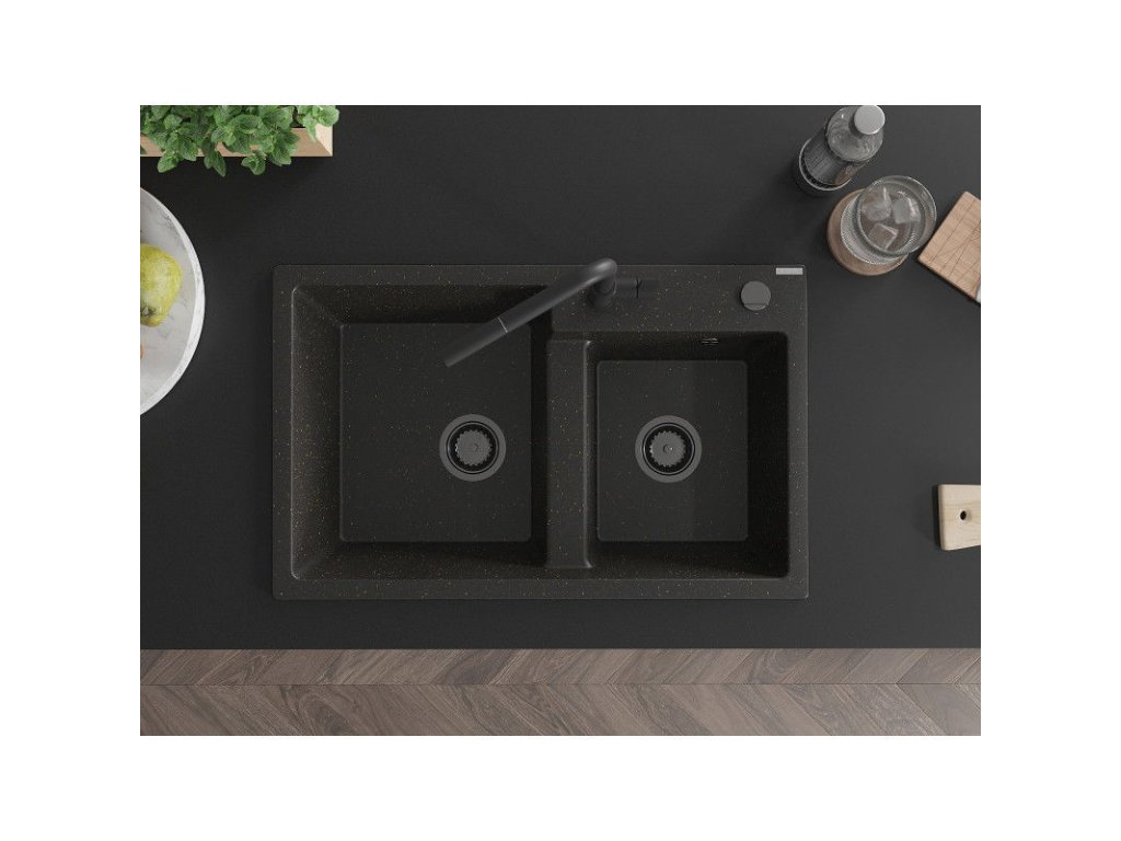 Granitový drez Mexen Tomas s 2 misami a kuchynskou batériou Flora, čierna/zlatá metalíza - 6516-75-670401-70-B