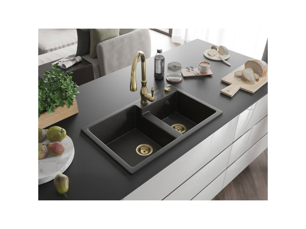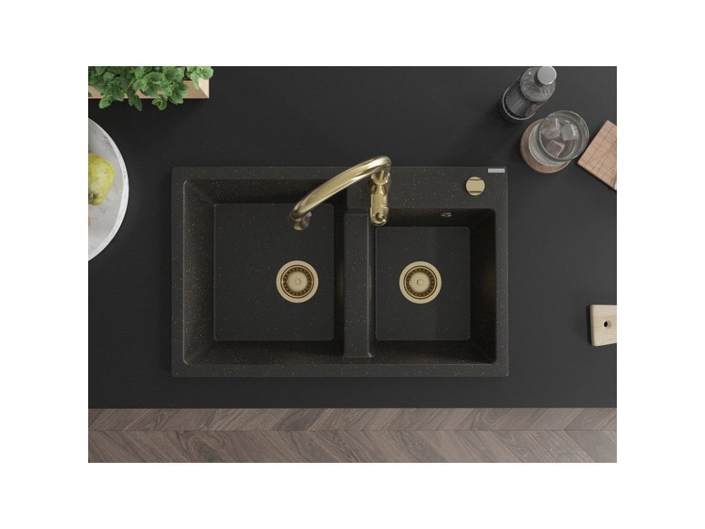 Granitový drez Mexen Tomas s 2 misami a kuchynskou batériou Savita, čierna/zlatá metalíza - 6516-75-672601-50