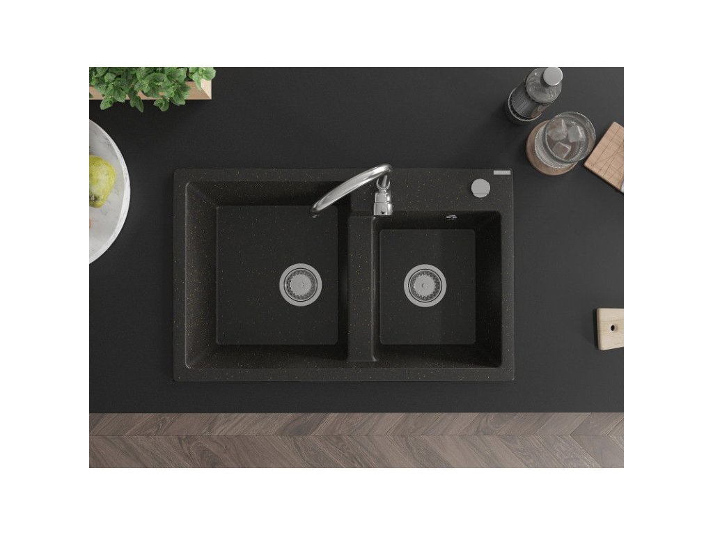 Granitový drez Mexen Tomas s 2 misami a kuchynskou batériou Telma, čierna/zlatá metalíza - 6516-75-670200-00