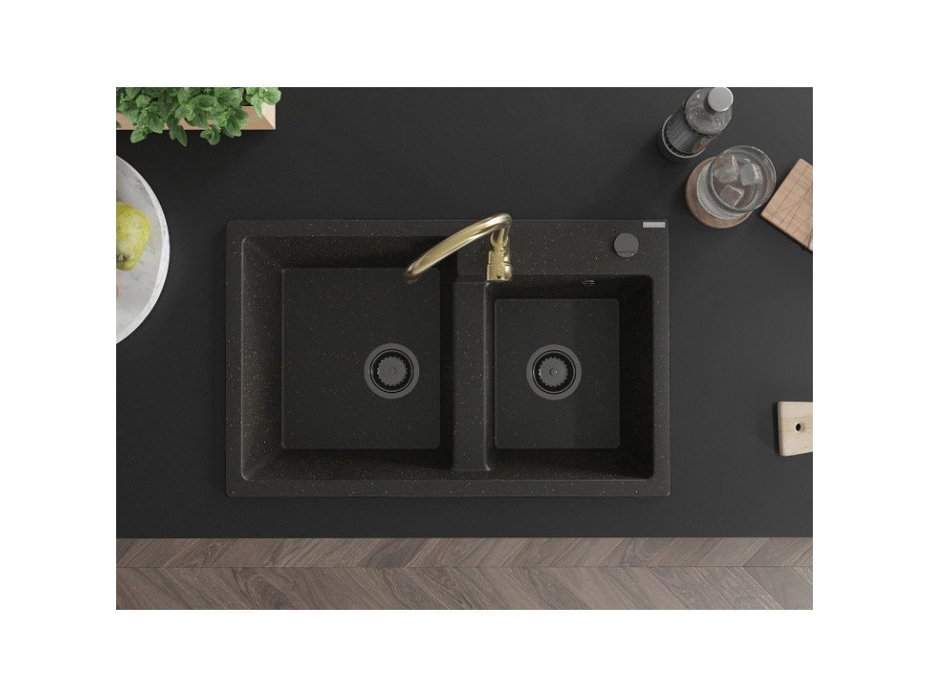Granitový drez Mexen Tomas s 2 misami a kuchynskou batériou Telma, čierna/zlatá metalíza - 6516-75-670200-50-B