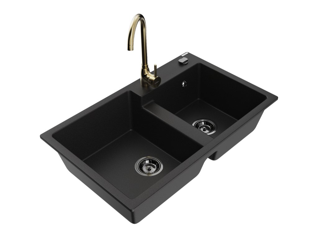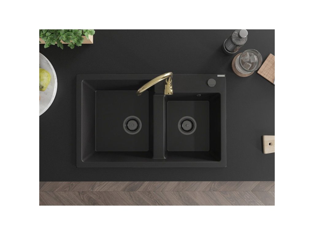 Granitový drez Mexen Tomas s 2 misami a kuchynskou batériou Telma, čierny - 6516-77-670200-50-B