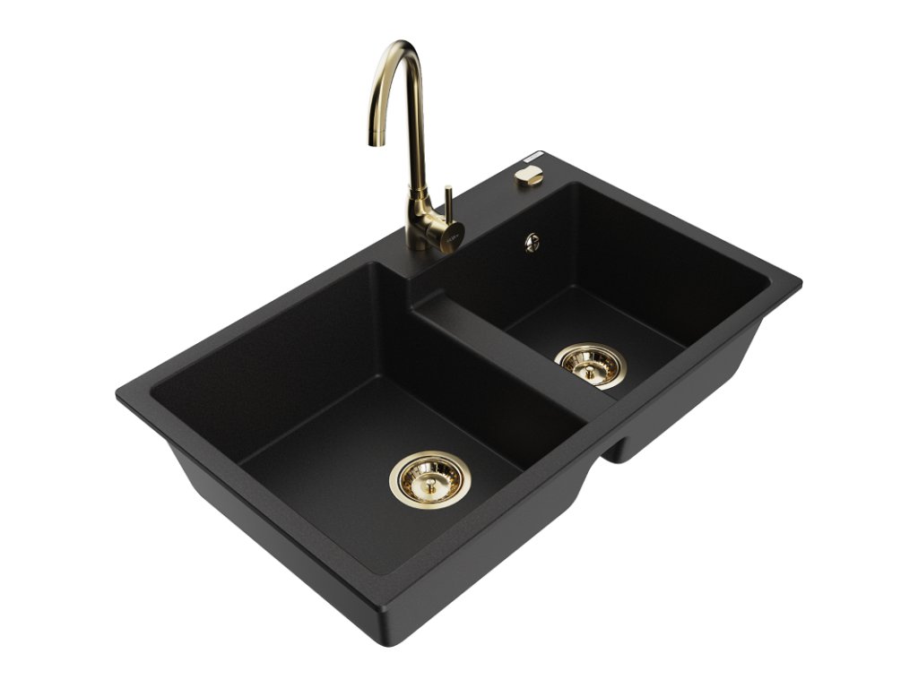Granitový drez Mexen Tomas s 2 misami a kuchynskou batériou Telma, čierny - 6516-77-670200-50