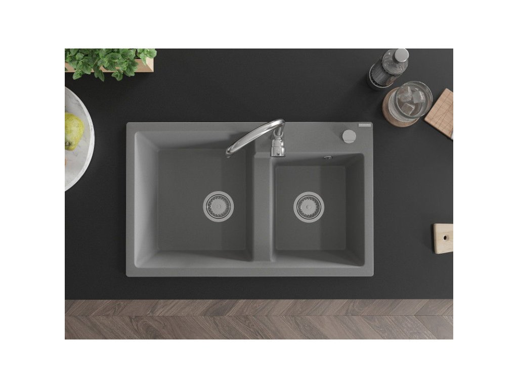 Granitový drez Mexen Tomas s 2 misami a kuchynskou batériou Telma, sivý - 6516-71-670200-00