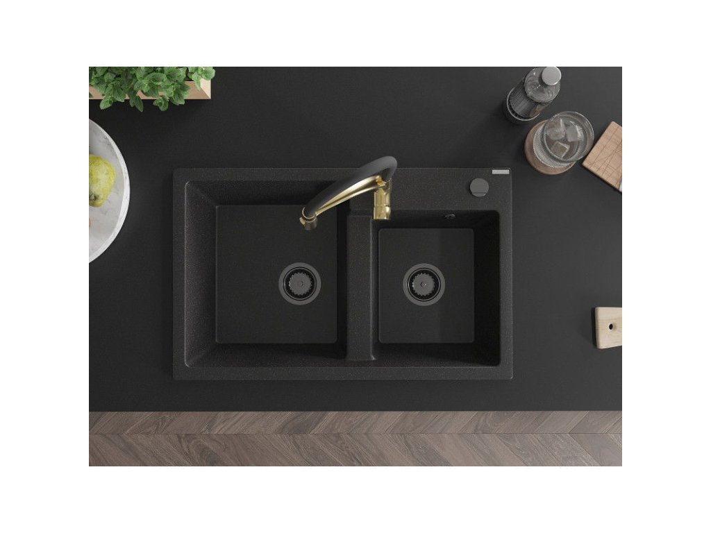 Granitový drez Mexen Tomas s 2 miskami a kuchynskou batériou Aster, čierna/strieborná metalíza - 6516-73-73450-57-B